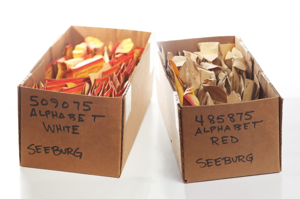 The bulk of the collection was two boxes labeled “509075 Alphabet White” which turned out to be the Seeburg LPC-1 type, and “485875 Alphabet Red,” the red block type I didn’t recognize. These letters were sorted into small envelopes containing 25 unused letters each.