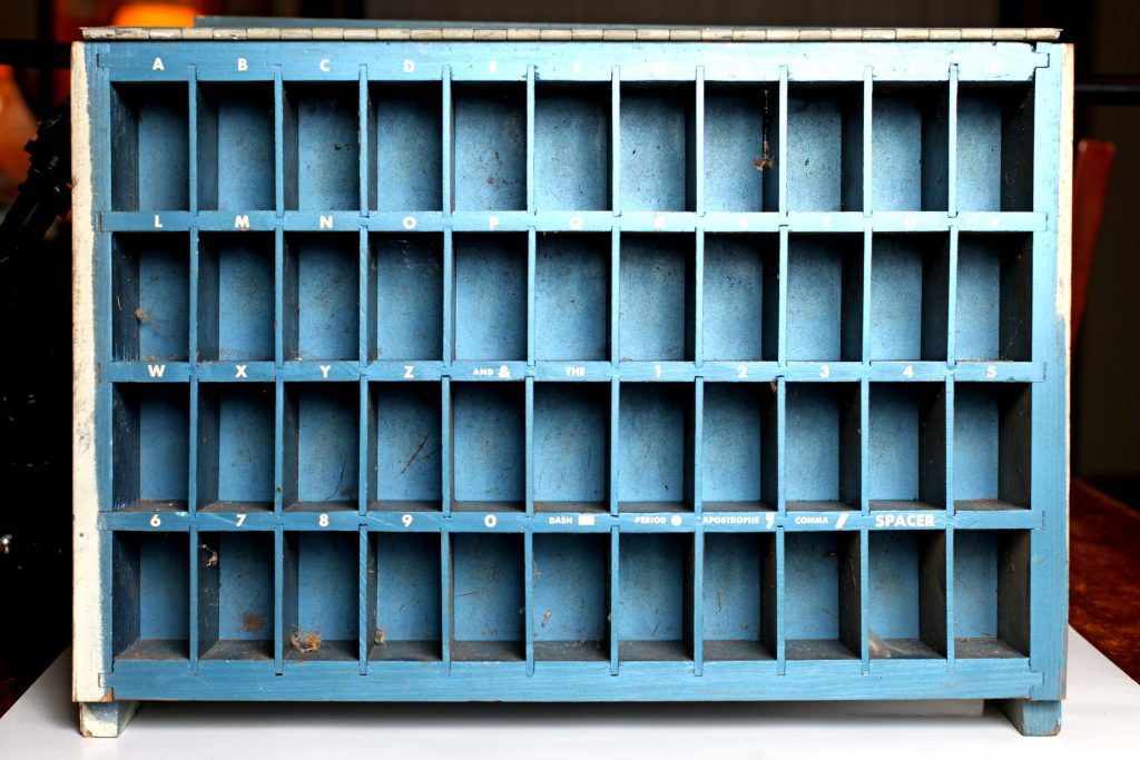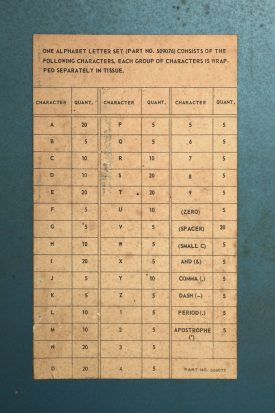 Finally, the storage box: It appears to be made specifically for this lettering, with each section carefully labeled, but it’s unclear if it was handmade by a distributor, or made and sold by Seeburg. It’s very well-engineerd, with a metal hinged lid that flips up. It’s angled back a bit, so the type stays in place when it’s mounted on a wall, which this one apparently was at some point. The outside of the lid and box was painted-over at some point, so I’m unsure of the original finish or if there were any markings on it, but the inside of the lid is unpainted blue-tinted anodized steel with a yellowed label glued in place: