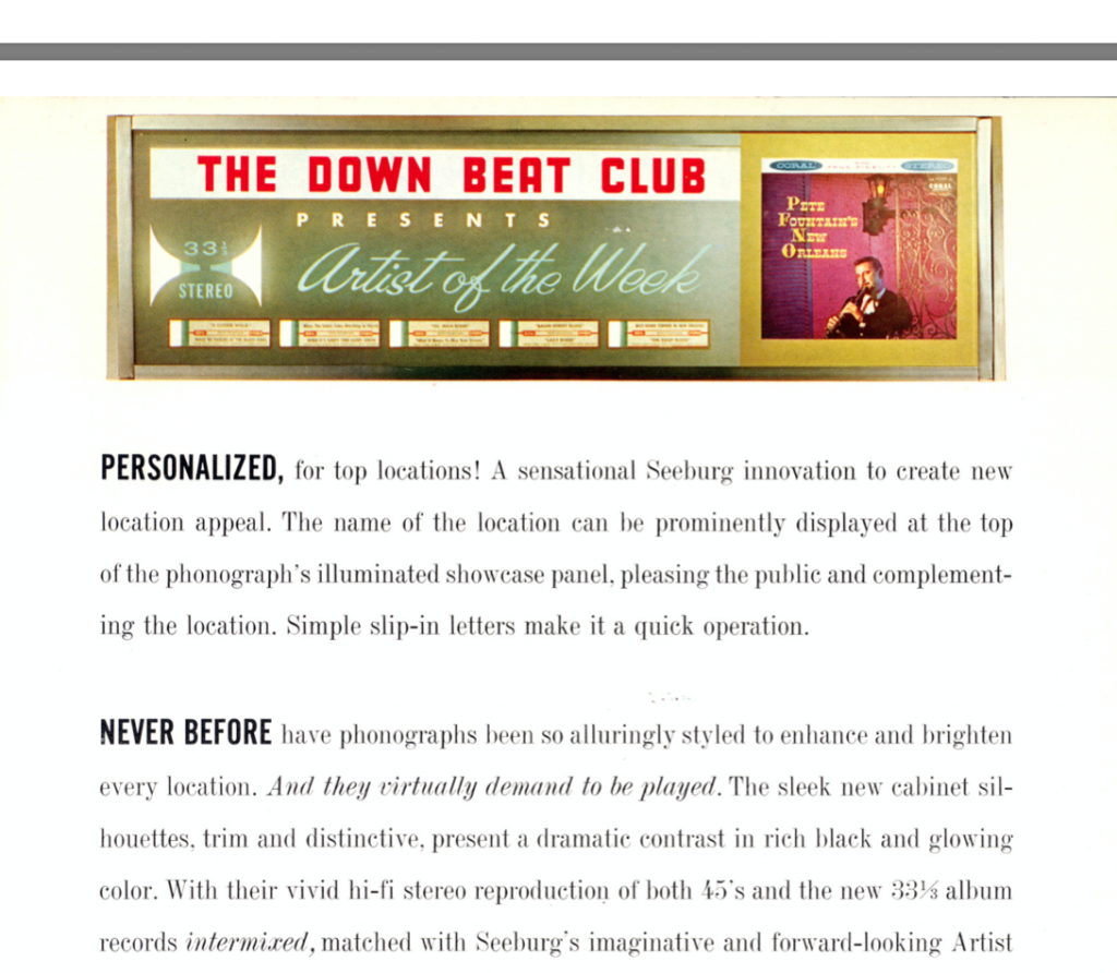 Oh! Almost forgot, I spent days trying to figure out what that block text was for, and eventually I tracked it back to the earlier (I was right!) Seeburg AY-series jukeboxes. But looking at photos, I couldn’t figure out where it was used. Then I found a PDF of an old sales brochure, and saw that the “Seeburg” logo at the top could be removed and replaced with the lettering!