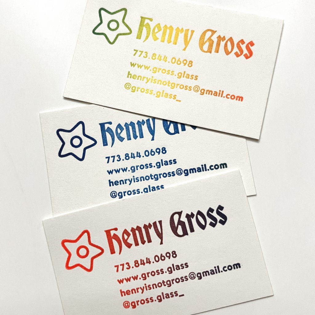 Mini-business cards for glass artist Henry Gross. Hand-set and printed in a wide variety of colors on a wide variety of papers.