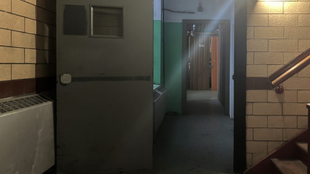 50. THIRD FLOOR FRONT LANDING: (Here’s where it gets a little tricky.) Go through the door into the hallway (more motion sensor lights! Some of them work!), walk past the women’s room and turn right, then left towards the FREIGHT ELEVATOR (51). Halfway to the freight elevator, turn right, down the long hallway, we’re the last door on the left (go to 70).